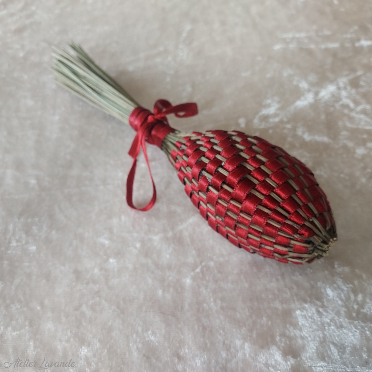 Fuseau de lavande de Provence Bicolore de fabrication artisanale avec ses rubans satin couleur Rubis et Blanc.
