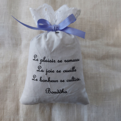 Sachet garni de lavande Bio de Provence de fabrication artisanale en tissu écru imprimé avec citation poétique :