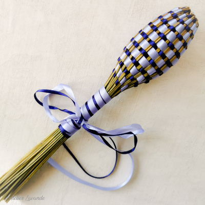 Fuseau de lavande de Provence Bicolore de fabrication artisanale avec ses rubans satin couleur violet Iris et bleu hortensia