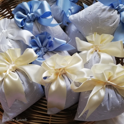 Les sachets en coton blanc sont fermés par un joli ruban de satin de grande qualité avec son nœud assorti.